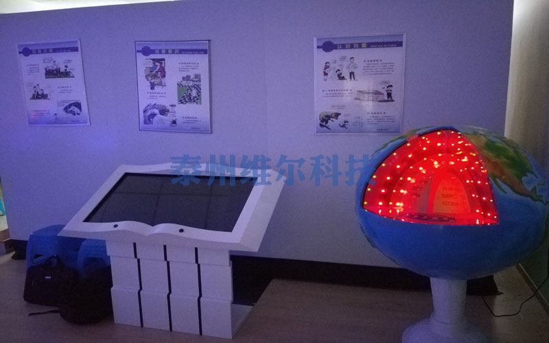 地球內(nèi)部構(gòu)造聲光電版 采用直徑1m地球儀北半球1/8對(duì)開,移動(dòng)半球展示地殼、地核、軟流層、上地幔、下地幔,按下相關(guān)按鈕,發(fā)光顯示并伴有同步語音介紹。