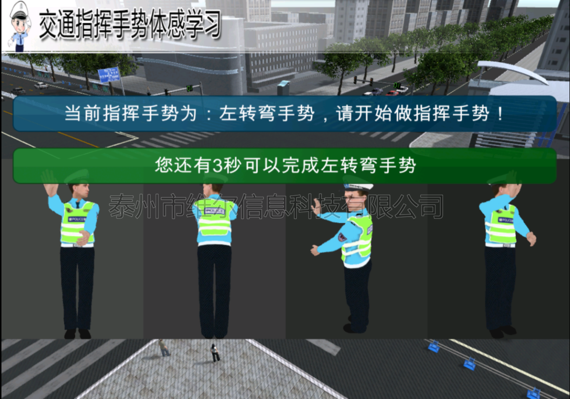 該系統(tǒng)是采用虛擬影像技術,加入即時摳像功能,實現(xiàn)交通警察手勢指揮交通的全息展示。顯示屏直立入口處,畫面顯示穿著制服的交通警察,無人走過時,畫面為交通警察面帶微笑靜止不動,當有人走過或靠近時,交通警察會根據(jù)紅綠燈信息做相應手勢指揮交通。 交警指揮手勢模擬游戲 游戲開始時,畫面上卡通交警依次顯示做指揮手勢的畫面,分別是:左轉彎、停止、左轉彎等待、右轉彎等待、右轉彎、變道、減速、靠邊停車、直線,同時會有相應語音提示。體驗者在感應區(qū)域中模擬交警的手勢,同時程序會通過kinect去識別,在規(guī)定的時間內依次完成模擬進行手勢學習,最后系統(tǒng)給出評分。每一輪游戲結束間隔5秒后,系統(tǒng)會自動開始下一輪游戲。